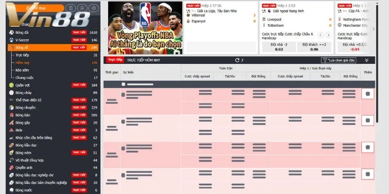 Thể thao Vin88 cũng đa dạng các kèo cược bóng rổ: kèo chấp điểm, kèo tài xỉu, kèo cược theo hiệp, kèo cá nhân cầu thủ. Để có thể chiến thắng kèo này, anh em cần tìm hiểu rõ phong độ và thành tích thi đấu của 2 đội, tham khảo ý kiến từ các bình luận viên am hiểu, từ đó đưa ra dự đoán chính xác nhất.